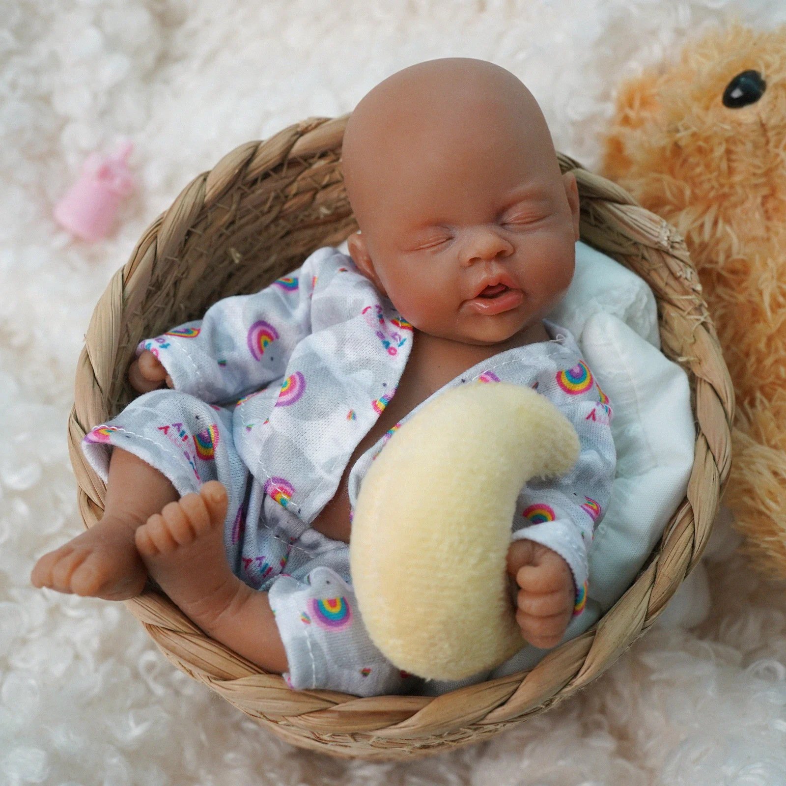 Každá panenka je odlita ze silikonu, což umožňuje jemnou flexibilitu a vytříbenou hmatovou odezvu. Jejich otevřené nosní dírky a ručně malované rty vytvářejí iluzi dýchání, zatímco zapečetěné nehty a vrstvené odstíny pleti zvyšují jejich realismus. Ačkoli jsou miniaturní, odrážejí vlastnosti, které najdeme u afroamerických batolat reborn panenek, zhuštěné do jemného měřítka vhodného pro vystavení.